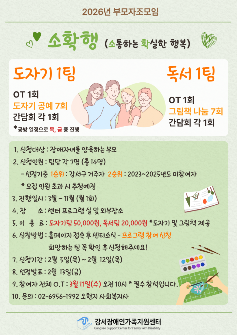 | 프로그램명 | [도자기팀!] 2026년 장애인부모자조모임 ‘소확행’ 참여자 모집 안내 | |||